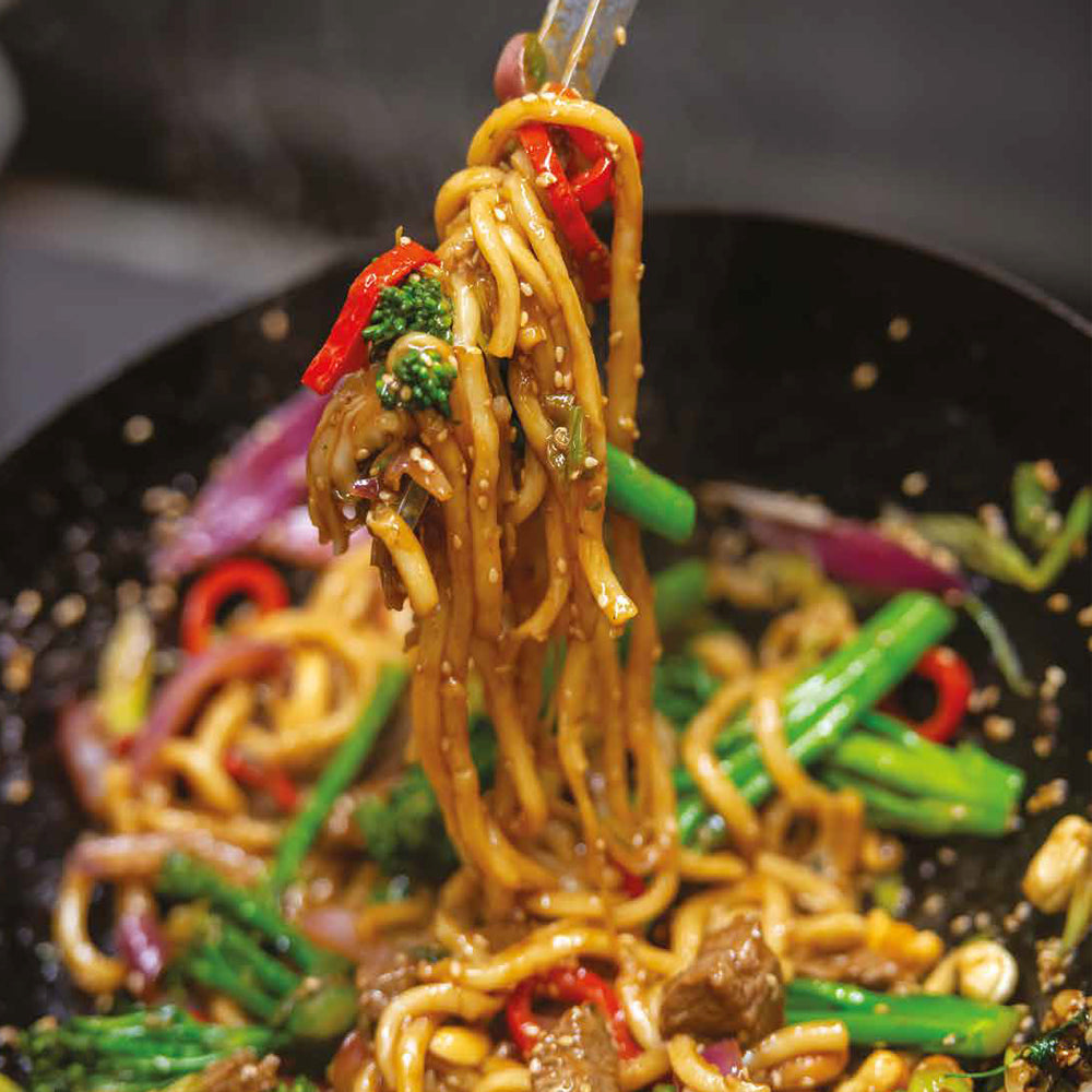 - Blanch the udon noodles in hot water and add to the beef, cooking for around 4 minutes to get a nice even colouring. Add the broccoli and sauces, continuously stirring, and add a little water at this point to help keep the noodles moist and give them a nice covering.