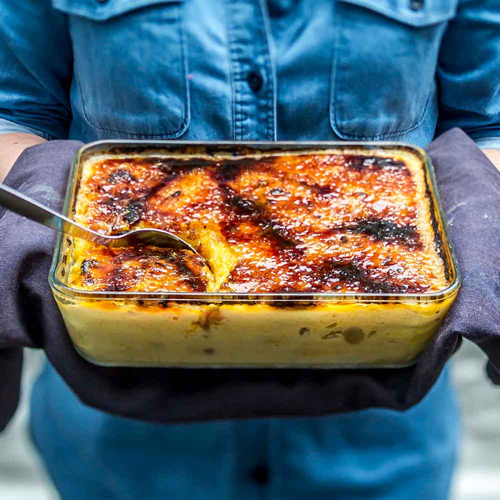 - To finish and give the bread and butter pudding an amazing texture, sprinkle caster sugar on top and blow torch to caramelise like a crème brûlée.